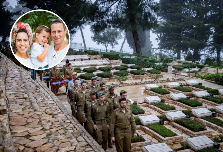 (Photo: Chaim Goldberg/flash90. Inset: Moti, of blessed memory, Revital, and their son, courtesy of the family)"You're calling just as I'm returning from a special day with expectant IDF widows," Revital Shamir shares, whose husband Moti Shamir was killed in a surprise attack while defending Kibbutz Re'im. "We had a very special and empowering day, and during our wrap-up talk, I told the organizers that while I felt strengthened, I also wondered how I ended up here in the first place. This feeling stays with me. Thankfully, I'm nearing the end of a pregnancy we've awaited for years, but I feel so disconnected. When asked about my birth plans, I only know that I want Moti there with me."