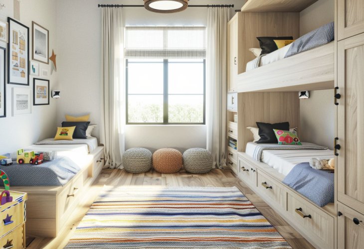 Continuing from our article on designing shared children's rooms, we decided to have artificial intelligence create designs suitable for more than one or two children. As usual, we were surprised by the results and received several children's rooms that will surely inspire you with ideas: