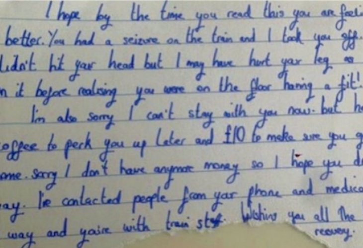 Shock washed over her as she read the blue inked words, which resonated with her long after. "I hope that when you read this, you feel much better. You had a seizure on the train, and I got you off. Your head is fine, though I may have stepped on your foot before realizing you were on the floor having a seizure. I'm sorry.
