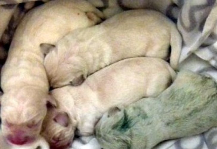This is a rare but harmless phenomenon that has occurred a few times in the past. The puppy's unique color is due to a pigment called biliverdin, found in the mother's placenta.