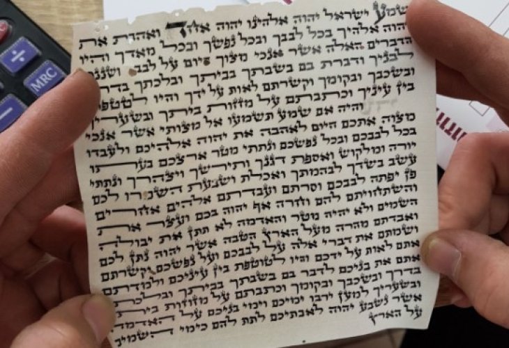 As mentioned, the home's mezuzahs were checked, and to everyone's astonishment, holes were found in the parchment in several places, including in the words "in your heart" and "you shall eat and be satisfied." See the photos: