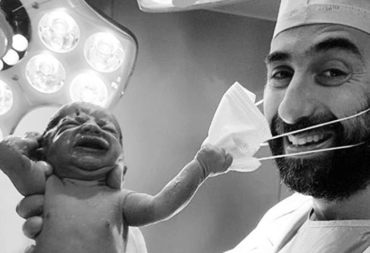 A doctor from Dubai recently shared a photo on social media that quickly went viral: it shows him holding a newborn baby who is tugging at his face mask.