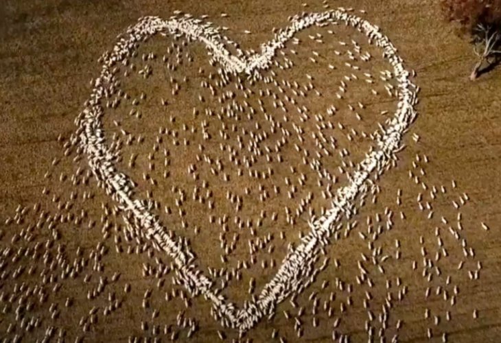 When his aunt passed away, he thought to himself, she had a huge heart, so why not honor her with a heart-shaped tribute? Indeed, Jackson scattered the feed in the shape of a heart, and as the sheep gathered to eat, a giant heart was formed and documented by drone.