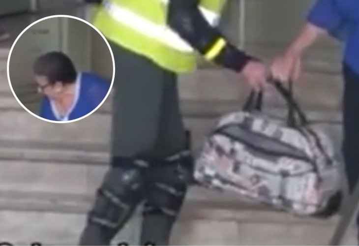 At one point, the video shows two people—one ascending the stairs and another descending. They both notice the elderly woman with her bag, hesitate about offering help, but ultimately continue on without aiding her.