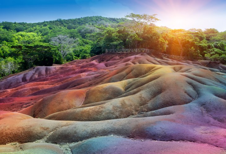 In the village of Chamarel on Mauritius Island, there’s a magical-looking place called the “Seven Colored Earth.” The volcanic soil there shows off beautiful colors like red, blue, and purple. It doesn’t wash away in the rain, and visitors walk on raised wooden paths to protect it.