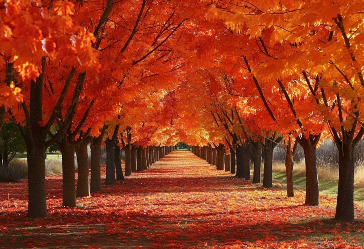 Maple trees are known for their lovely leaves and sweet syrup. Some types, like the sugar maple, are used to make maple syrup that’s famous for its rich flavor. The wood from maple trees is also used to make furniture and musical instruments. In Oregon, USA, rows of maple trees were planted to create a magical path that’s perfect for a peaceful walk.