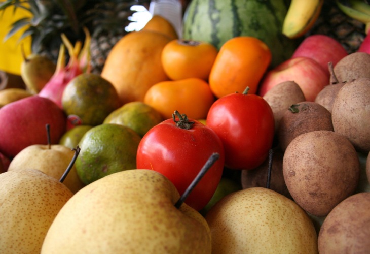 Bananas, pears, apples, tomatoes, lettuce, zucchini, mushrooms, avocados, cabbage, eggplant, carrots, apricots, peaches, plums, mangoes, and bananas.