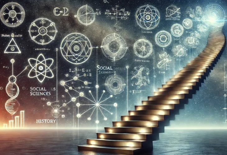 At the top are mathematics and physics, where every theory can be tested clearly and repeatedly. Below them are chemistry and biology, where experiments are less exact. Further down are the social sciences and history, where “truth” often depends on interpretation and public consensus more than on hard evidence.