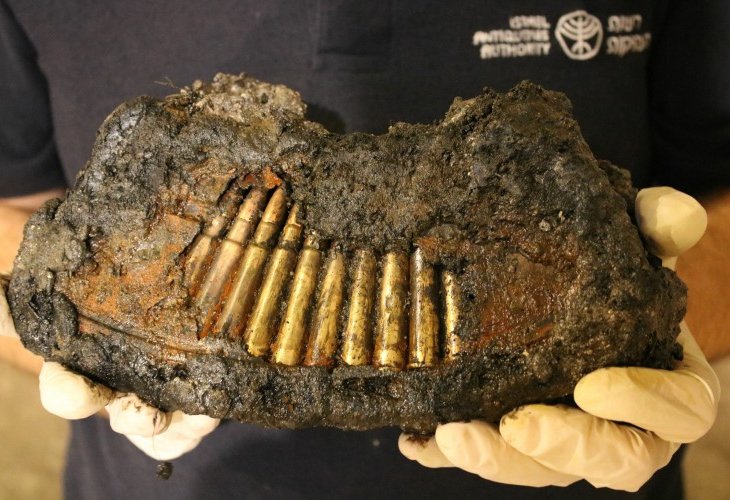 A broken magazine with bullets of a Bren gun (Credit: Yoli Schwartz, Israel Antiquities Authority)