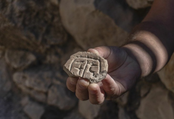 Persian period seal (Photo: Shai Halevi, Israel Antiquities Authority)The seal is made from a large pottery shard of local production, featuring a circular frame divided into two sections on its exterior, each containing several linear engravings. These engravings might represent two figures or could be a pseudo-epigraphic seal (bearing designs meant to resemble letters). The seal's back shows a break where a handle might have once been attached. Its diameter of approximately 8 cm suggests it was used to seal large objects.