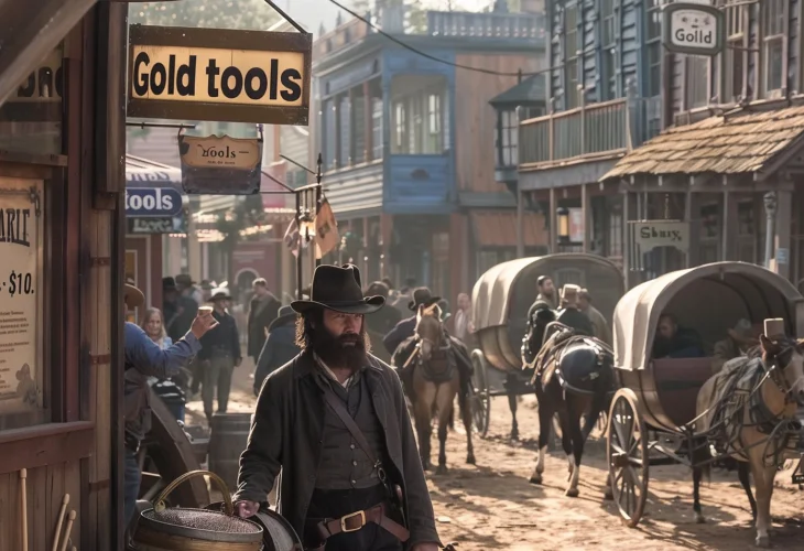 Just two years later, everything changed. Thin threads of gold were spotted in the rivers near San Francisco. John Marshall, the man who first found the gold, tried to keep it secret. But Samuel Brannan had other ideas. Hearing about the gold in the American River, he quickly bought every shovel and sieve he could find for just pennies. Then he ran through the streets shouting, “Gold in the river! Gold in the river!”