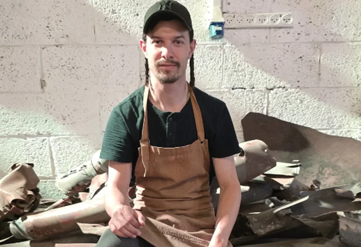(צילום: Lilia Megera)Gross describes his exhibition: “Most of the raw materials that make it up are, of course, rocket fragments, and there is also a large memorial wall on which are displayed burned objects from one of the homes in Beeri. Here too, behind the story there is a great miracle, as the family was in the safe room throughout that entire day while the terrorists were walking around the house and burning it, but even though the safe room door was not locked, the family was not discovered and was saved. To the burned objects that I display on the wall I added plants from the family’s yard, which symbolize both destruction and renewal together. One of the especially impressive pieces in the exhibition is a large mezuzah made from fragments and coated with real gold. After the exhibition ends, I aspire to bring it to Ben Gurion Airport and place it at one of the gateways of our country, because in essence there is nothing more symbolic than that.”