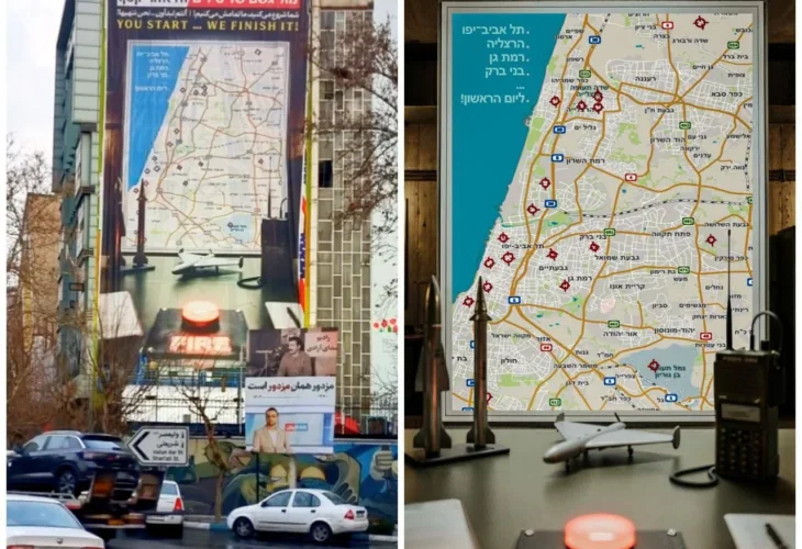 Iranian media on Sunday published footage of threatening signage erected in Palestine Square in Tehran showing a map of Israel with sites in the Gush Dan region marked as future targets. The sign included a Hebrew message reading, “מול גשם של טילים זה אזור קטן” — “Facing a rain of missiles, this is a small area.” An accompanying English slogan warned: “You started it, we will finish it.”