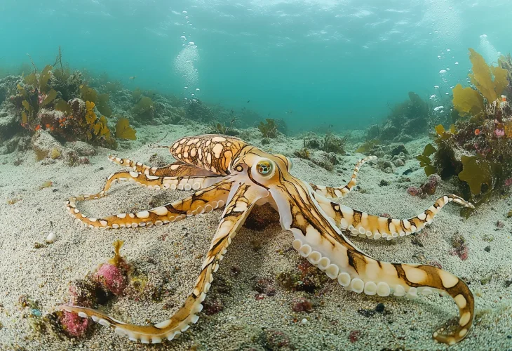 Within seconds, the mimic octopus can spread its arms and body to resemble a venomous sea snake, deterring predators who instinctively keep their distance. If danger approaches from another direction, it may flatten itself against the ocean floor and imitate a flatfish. In other situations, it drifts through the water, moving like a jellyfish, convincing would-be attackers that it is not worth the risk.