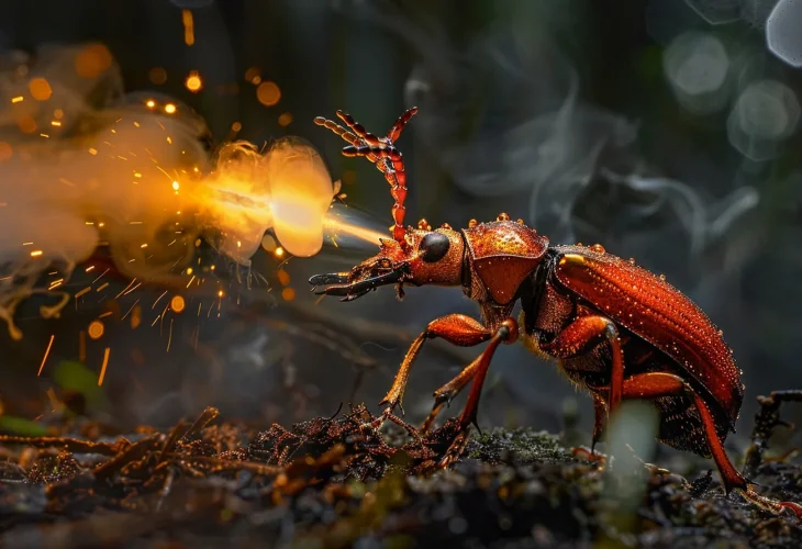 The result is a hot spray that can reach temperatures of around 100°C. The beetle fires this spray in short, controlled bursts and can aim it in almost any direction. Whether the attacker is an ant, spider, or frog, the blast causes the predator to retreat quickly.