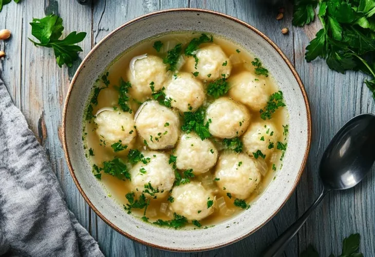 2 carrots, sliced into rounds A bunch of parsley Spices: salt, black pepper 1 onion, diced Green onions for serving 1 egg 1 liter of warm water 1 kg of matzo meal 4 eggs 1 tablespoon of salt 1 tablespoon of black pepper Mix all the ingredients for the matzo balls and refrigerate for 30 minutes. Cook the soup until all the ingredients are tender, then add the chilled matzo balls once the water is boiling. Crack an egg (or more, depending on your personal taste) into the soup once the matzo balls are cooked. Serve with chopped green onions on top.Ingredients