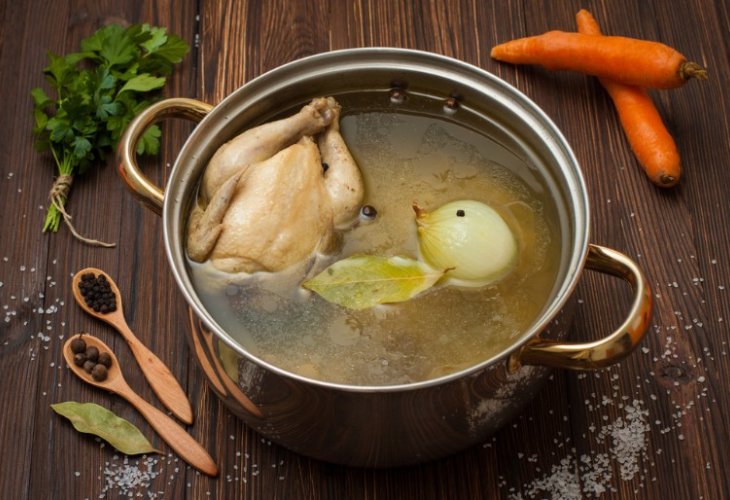 (Illustration photo: Shutterstock)1 whole chicken 10½ cups water (2.5 liters) 6 carrots 1 parsley root 1 celery root 3 celery stalks 10 sprigs parsley 10 sprigs dill 1 sprig thyme 2 garlic cloves 1 tablespoon salt 1 tablespoon sugar 4 whole black peppercorns 4 allspice berries Prepare the pot: Use a pot that is oven-safe (no plastic handles). Build the base: Place the whole vegetables, celery leaves, chicken, and water into the pot. Add salt and sugar and bring to a boil. Add the peppercorns and allspice. Slow cook in the oven: Transfer the pot to a preheated oven at 350°F (180°C) and let it cook undisturbed for 12 hours. Strain the soup: Remove from the oven and strain: First through a regular strainer to remove vegetables and solids Then through cheesecloth for a perfectly clear broth Serve: Return only the chicken to the soup and serve. You can add cooked carrots, or serve as a clear broth.Ingredients