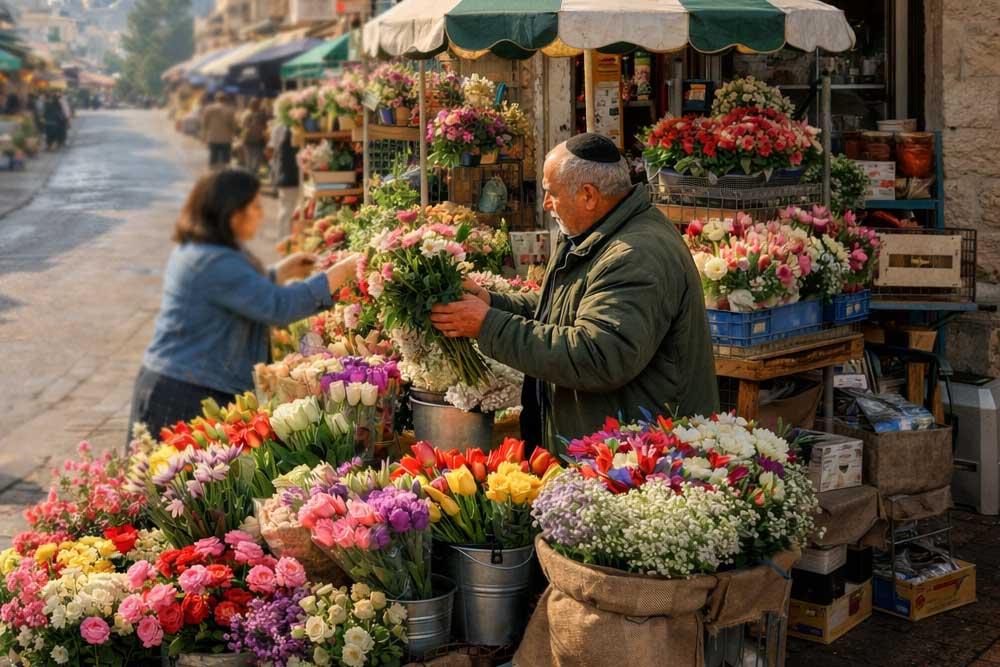 A bright Friday morning. The scent of fresh challah drifts from the neighborhood bakery. Lines wind through the shops as people finish their weekly shopping in honor of Shabbat, or grab those last-minute essentials. And on the corner, a flower seller stands with buckets of fresh bouquets.