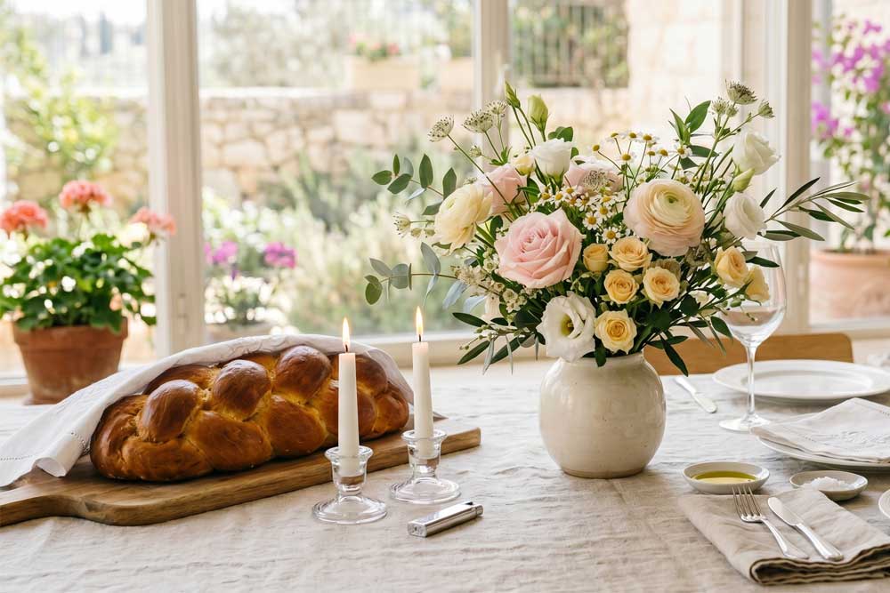 There’s something about a thoughtfully arranged bouquet that transforms the table. It adds color, warmth, and a quiet sense of celebration. Together with the challah, the Kiddush cup, the wine, and the dishes, the flowers complete the picture.