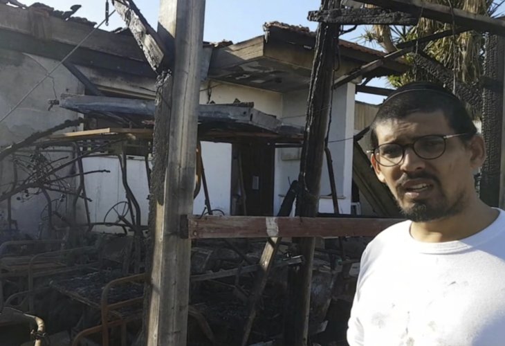 Menachem Shlomo against the backdrop of the house (Photo: Meir Chertokov)The miracle of the Chertokov family: Their house burned down completely, and while they were left homeless, their Gemara books, tefillin, family photos, and a few items with sentimental value survived the flames that soared up to five meters high. The family's home, located in the settlement of Yavne'el in northern Israel, caught fire while they were celebrating their son's Bar Mitzvah. As the celebration was in full swing, reports of the unfolding disaster began to flow in. Father Menachem-Shlomo and mother Simcha decided they would not put a halt to their son's celebration. Indeed, they sang 'The whole world is a very narrow bridge', but when they returned home, they were shocked: the house and the off-road vehicles belonging to the family's business were up in flames.