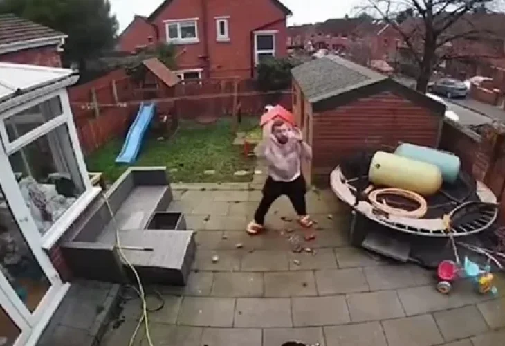 Another video of Storm Eowyn hitting Britain and its surroundings shows a man nearly hit by a part of his roof that fell to the ground. (Credit: Channel 14)