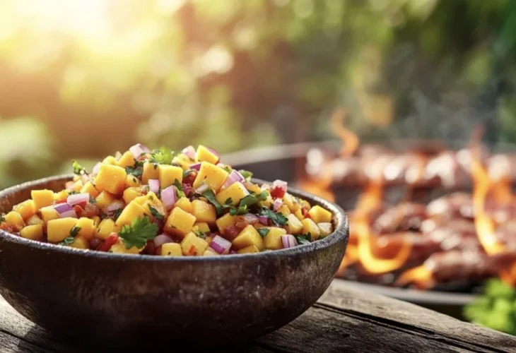 What's the connection between mango and meat? You might not believe it, but this sauce is one of the most delicious for barbecue, as it combines sweet, spicy, and tangy flavors. If you love these flavors, this marinade is for you. So how do you make this salsa? Blend together fresh mango, spicy green pepper, a handful of chopped cilantro, chopped red onion, and a touch of lime.