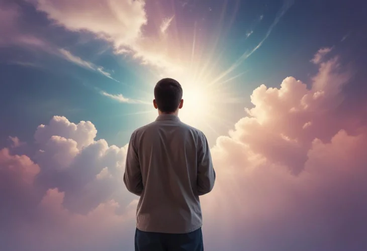 Image of a man standing with his back to the viewer, gazing at the blue sky with white clouds and looking directly towards the sun.